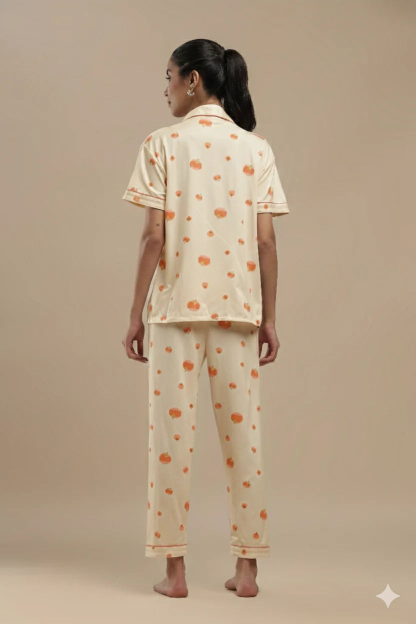 Ease into comfort with the Fruit Cream 3 Piece PJ Set, made for slow mornings and versatile lounging. The collared button-down shirt features short sleeves and vibrant orange piping, adding a cheerful, polished touch to your everyday comfort.