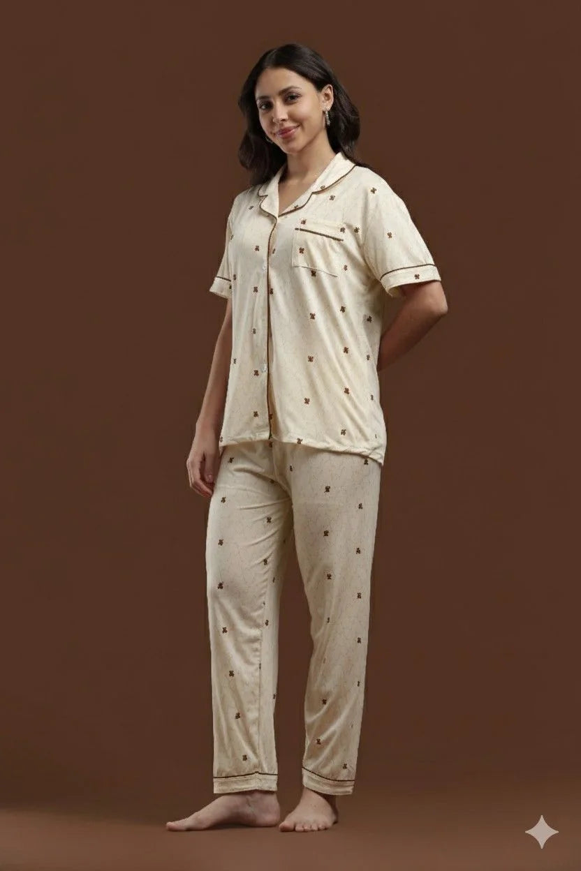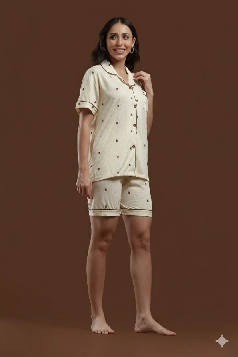 Stay cozy and cute with this playful brown teddy print 3-piece set, designed for those who love a mix of sweet charm and total relaxation. The collared button-down shirt features short sleeves and contrast piping, giving your loungewear a quirky yet classic vibe that’s perfect for all-day wear.