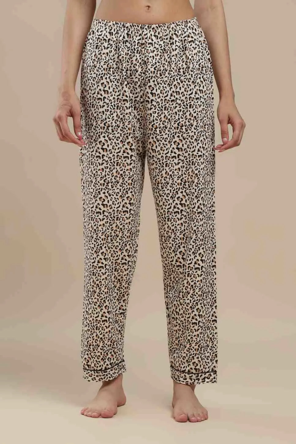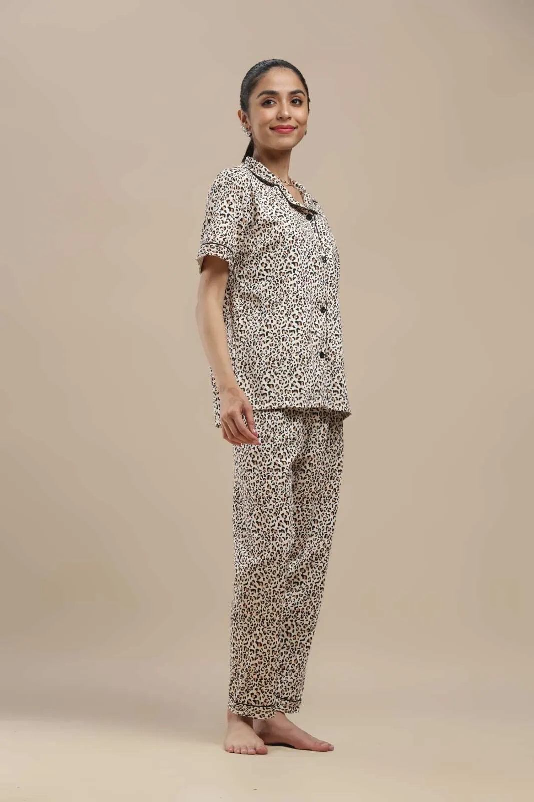 Bring a bold yet cozy feel to your lounge routine with this playful leopard-print set. The collared button-down shirt features short sleeves and a classic animal motif, adding a fun and eye-catching look to your bedtime routine.